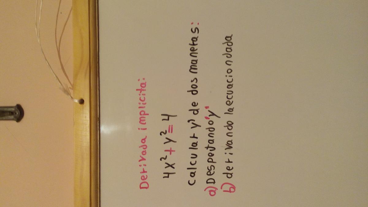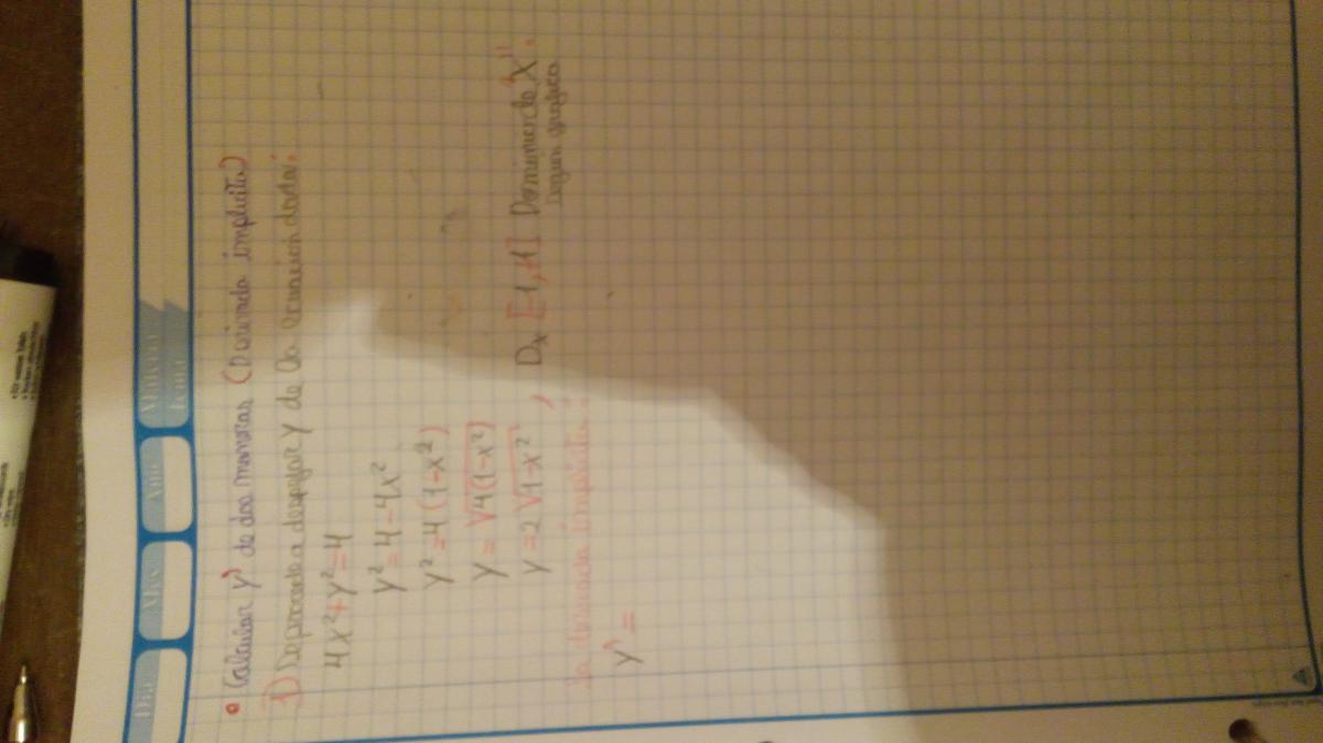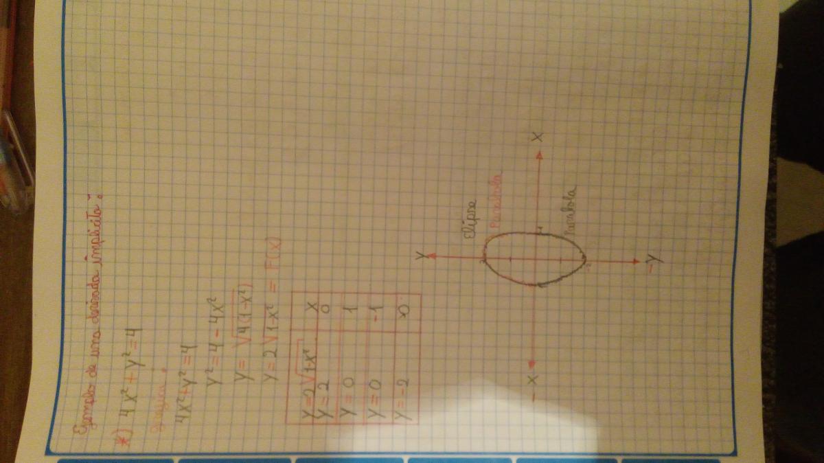 Yo ya saque lo que es la grafica y es una elipse cuyo dominio x es (-1y 1) pero para hallar la derivada implícita me perdi. Ayuda por favor aca dejo foto de mi avance y el anunciado.