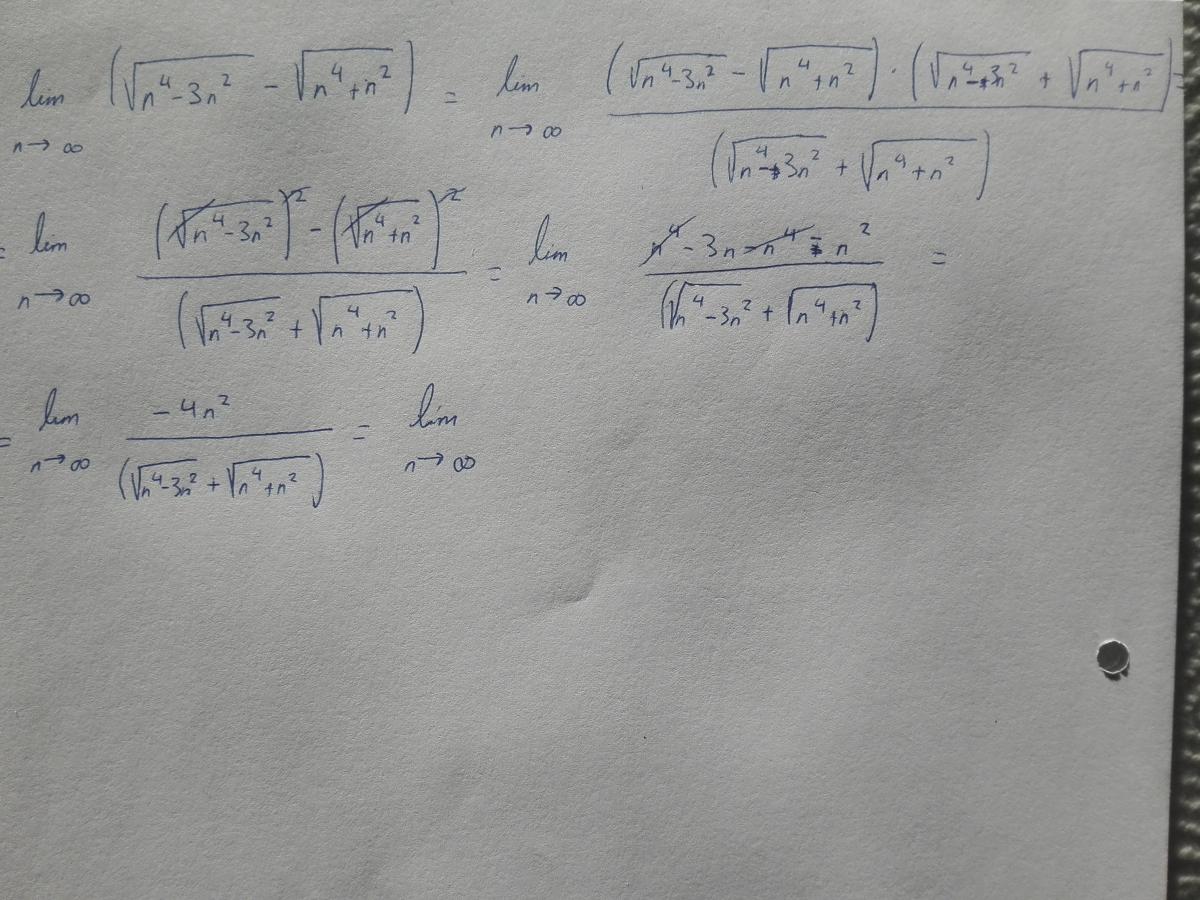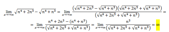 Lo resolvemos viendo los coeficientes de mayor grado del numerador y del denominador y como el grado numerador es mayor que el grado del denominador el resultado es infinito