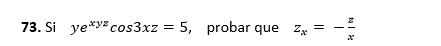 y*ex*y*z*cos(3*x*z) = 5, que define implícitamente a z como función de x e y (observa que el primer factor y el tercer factor deben tomar valores distintos de cero, y observa que el segundo factor toma valores estrictamente positivos).