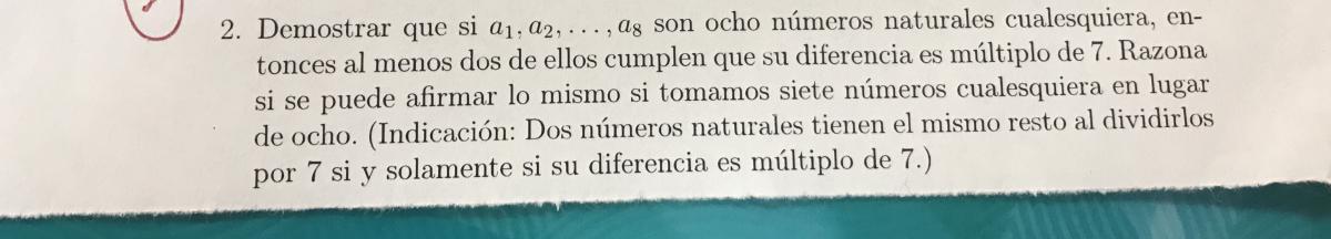 "Demostrar que si de 8 números naturales cualesquiera, dos de ellos cumplen que su diferencia es múltiplo de 7"