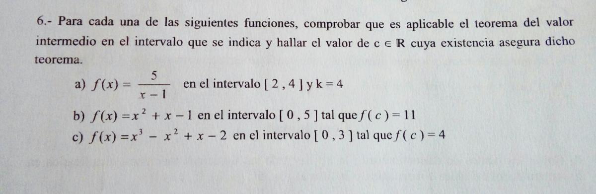 Observa que la función es discontinua en x = 1, que no pertenece al intervalo, por lo tanto tienes que es continua en el mismo. Luego, evalúas en los extremos del intervalo, y tienes: f(2) = 5 y f(4) = 5/3, y observa que el valor k = 4 está comprendido entre estos dos valores.
