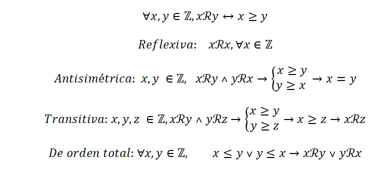 Determinar si la relación definida en los enteros positivos por (x,y) ∈ R si x≥y es reflexiva, simétrica, antisimétrica, transitiva y/o de orden parcial. Justificar la respuesta.