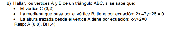 Trate de buscar el punto en el que se cruza la altura trazada desde el vértice A y la mediana que pasa por B, luego de tener ese punto conseguía el punto medio de AC ( Por definición de la mediana). Mi inconveniente es que no como buscar el punto medio de BC sin la razón de el segmento AP. Por su atencion muchas gracias.