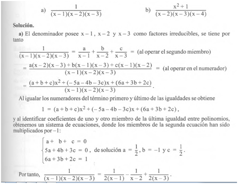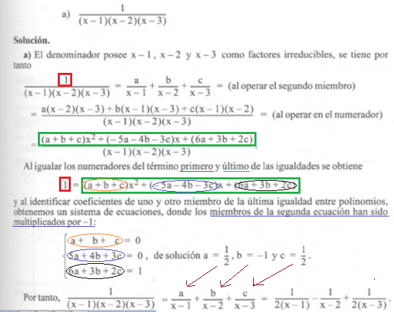Tengo el siguiente problema (descomposición en factores simples) y me he quedado bloqueada hace 4 días porque no sé de dónde salen los resultados. ¿Me podríais ayudar y decidme cómo salen los resultados paso a paso? Os mando una imagen. Ejercicio A. No se seguir desde donde pone: "al igualar los numeradores del término primero...". ¿De dónde salen los resultados de las 3 ecuaciones? ¿y el resto del problema? Sin entenderlo, creo que el ejercicio B tampoco sabré hacerlo. Muchísimas gracias.