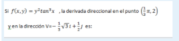 Luego, con la expresión del vector dirección y las expresiones señaladas (1) (2), puedes plantear para la derivada direccional de la función en el punto en estudio: