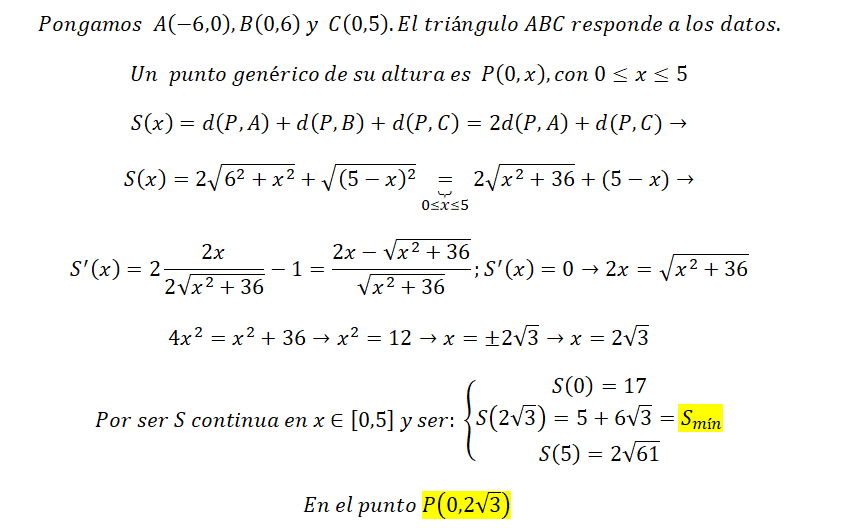 Determinar un punto sobre esa altura tal que la suma de sus distancias a los tres vértices sea la mínima.