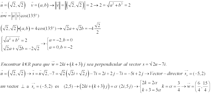 Sea u=√2i+√2j a) Hallar un vector v que tenga la misma norma que u y forme un ángulo de 135 grados con el semieje positivo del antihorario). b)Encontrar k€R para que w=2k+(k+3)j sea perpendicular al vector s=√2u-7i.