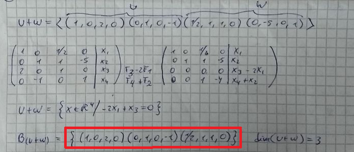 La matriz cuyas columnas son los 4 vectores de ambas bases, después de aplicarle transformaciones elementales, tiene rango 3. Por tanto, la dimensión de U+V es 3. Y un menor básico de orden 3 lo forman las tres primeras columnas. Como la dimensión del espacio vectorial es 4, el subespacio U+V está definido por 4-3=1 ecuación cartesiana.