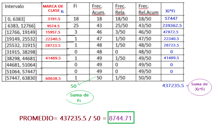 En tu ejemplo, la 1ª marca de clase sería (0+6383)/2= 3191.5, la 2ª (6383+12766)/2= 9574.5 , y así con todas.