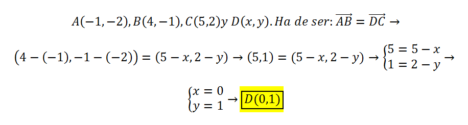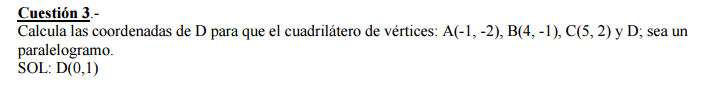 Me ayudan por favor: Calcula las coordenadas de "D" para que el cuadrilatero de vértices A (-1,2), B (4,-1), C (5,2) y D sea un paralelograma