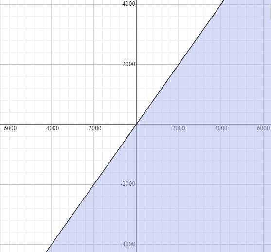 Con la inecuación y≤x obtendríamos una recta (o unión infinita de segmentos) que comprendería desde la bisectriz del tercer cuadrante (225º) hasta la del primer cuadrante (45º), ambas incluidas (estas bisectrices son iguales a la recta referida)