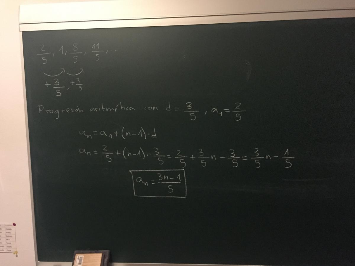 B) Encuentra el término general de la siguiente progresión: 2/5, 1, 8/5, 11/5... (Hazlo con fracciones).