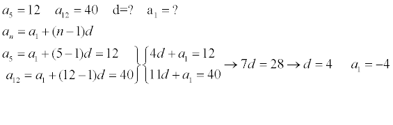 A) En una progresión aritmética conocemos los términos a5= 12 y a12=40. Calcula la diferencia y el primer término.