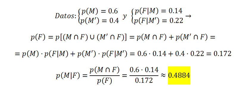 una población está compuesta en un 60% de mujeres. El 14% de las mujeres y el 22% de los hombres son fumadores. Si una persona elegida al azar fuma, la probabilidad de que sea mujer es: