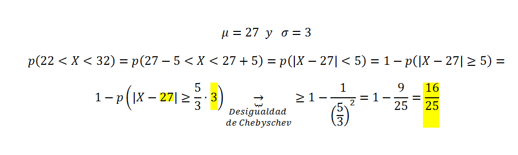 Sea X la temperatura a las 12.00 h del mediodía en un determinado lugar geográfico. Supongamos que en promedio X es de 27 grados con una desviación típica de σ=3 grados. Encuentra una cota inferior para la