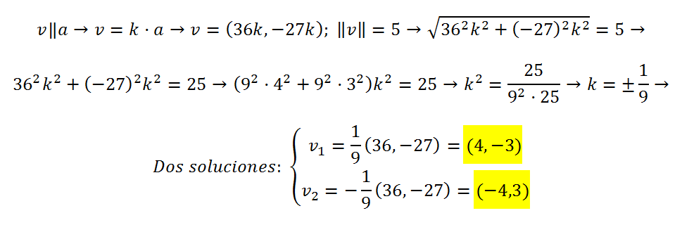 Hallar el vector v de modulo 5 que sea paralelo al a= (36, -27)