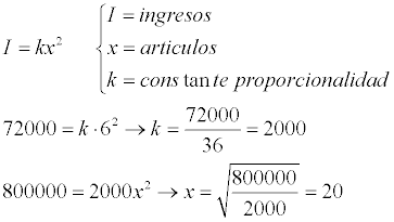 Se sabe que los ingresos por la venta de ciertos artículos es directamente proporcional al cuadrado del número de ellos. Si por la venta de 6 de ellos se recibe un ingreso de $72.000. Determinar la constante de proporcionalidad entre estas magnitudes y el número de artículos que se deben vender para que el ingreso sea del orden de los $800.000.Según mi criterio se desarrolla así: