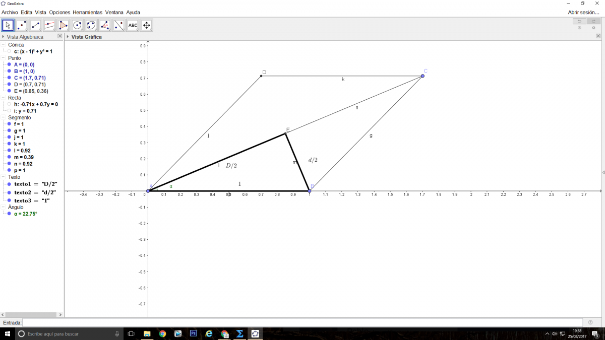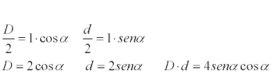 y observa que la longitud del cateto adyacente al ángulo es la mitad de la longitud de la diagonal mayor (ad = D/2), observa que la longitud del cateto opuesto al ángulo es la mitad de la longitud de la diagonal menor (op = d/2), y observa que la longitud de la hipotenusa del triángulo es L = 1 cm.