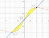 Sara, como no indicas en tu perfil que nivel de estudios tienes, no sé que herramientas de integración utilizas. Igual te extraña que utilice una doble integral (integral iterada) para el cálculo de áreas de regiones planas, te explico. Esa doble integral que puse representa el volumen del sólido formado por el recinto amarillo como base, paredes laterales verticales y como superficie superior la gráfica f(x,y)=1 (altura 1), esto equivale numéricamente al área de la región pedida. Espero que te ayude a comprender de dónde viene el procedimiento típico, si es que no lo sabías.![]()