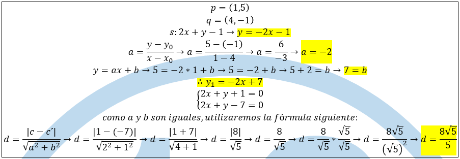 Dada la recta r que pasa por (1,5)y (4,-1)calcula la distancia a la recta s: 2x+y=-1
