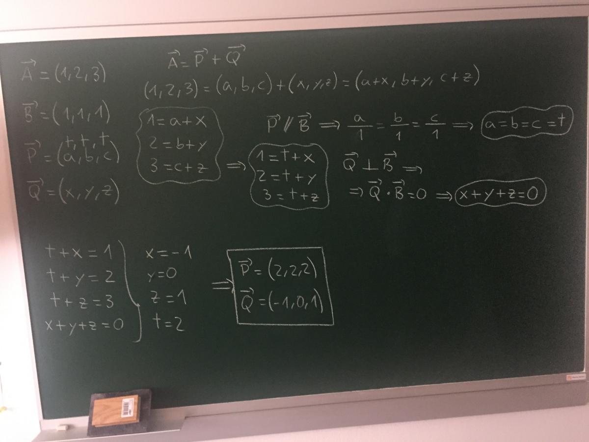 Sean los vectores A=<1; 2; 3> y B=<1;1;1> 2 vectores en R3. Hallar los vectores P y Q de R3 tales que A=P+Q, siendo P paralelo a B y Q ortogonal a B