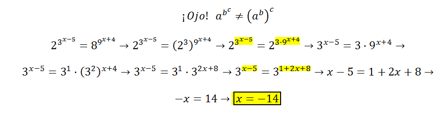Un ejercicio que parecía aparentemente fácil me ha estado dando quebraderos de cabeza ... Se trata de manejar las propiedades de las potencias, potencia de una potencia, en general. La solución del ejercicio es x=-14. A ver si conseguís aclararme esto!