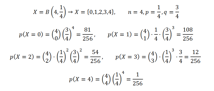 Supongamos que esta pareja de conejos han tenido 4 hijos, y consideramos la variable aleatoria X número de conejitos blancos entre los 4. Calcular la función de probabilidad de la variable aleatoria X.