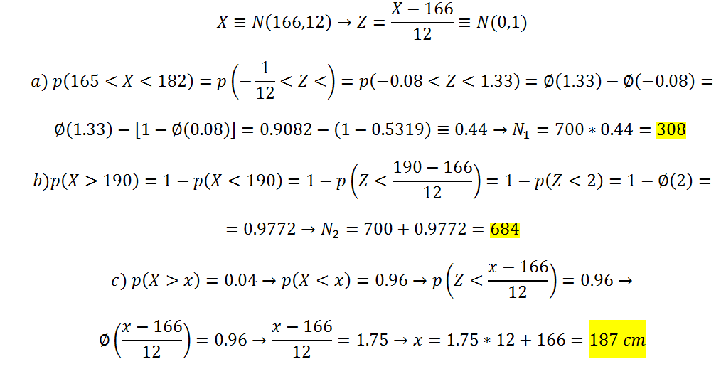 Los 700 soldados de un cuartel poseen una altura que se distribuye según una normal de parámetros μ = 166 cm, σ = 12 cm. Hallar el número aproximado de soldados cuya altura esté comprendida entre 165 y 182 cm. ¿Cuántos medirán más de 190 cm? Si los mandos del ejercito forman un batallón de ''gastadores'' con el 4% de los soldados más altos, ¿a partir de qué altura deben seleccionarse?