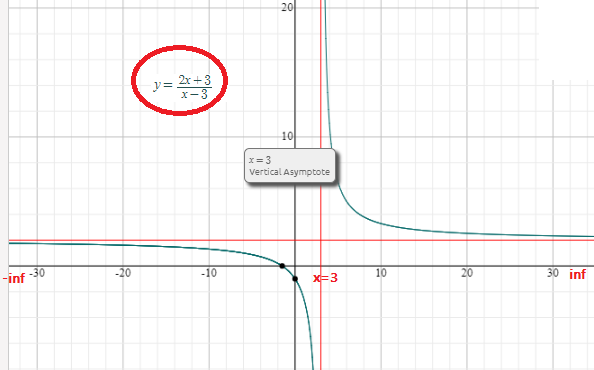 y=2x+3/x-3; en +∞,-∞ y en 3.