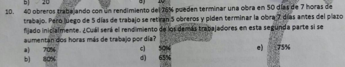 40 obreros trabajando con un rendimiento del 76% pueden terminar una obra en 50 días de 7 horas de trabajo, pero luego de 5 días de trabajo de retiran 5 obreros y piden terminar la obra en 7 días ¿con que rendimiento deberán trabajar los restantes esta segunda parte si aumentan 2 horas de trabajo mas por día?