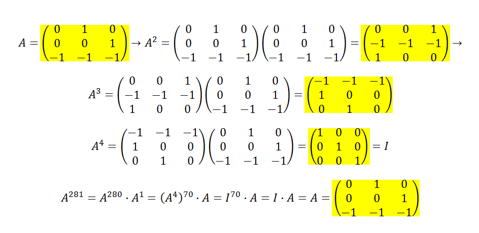 A281 = A280+1 = A280*A1 = A4*70*A = (A4)70*A = (I3)70*A = I3*A = A.