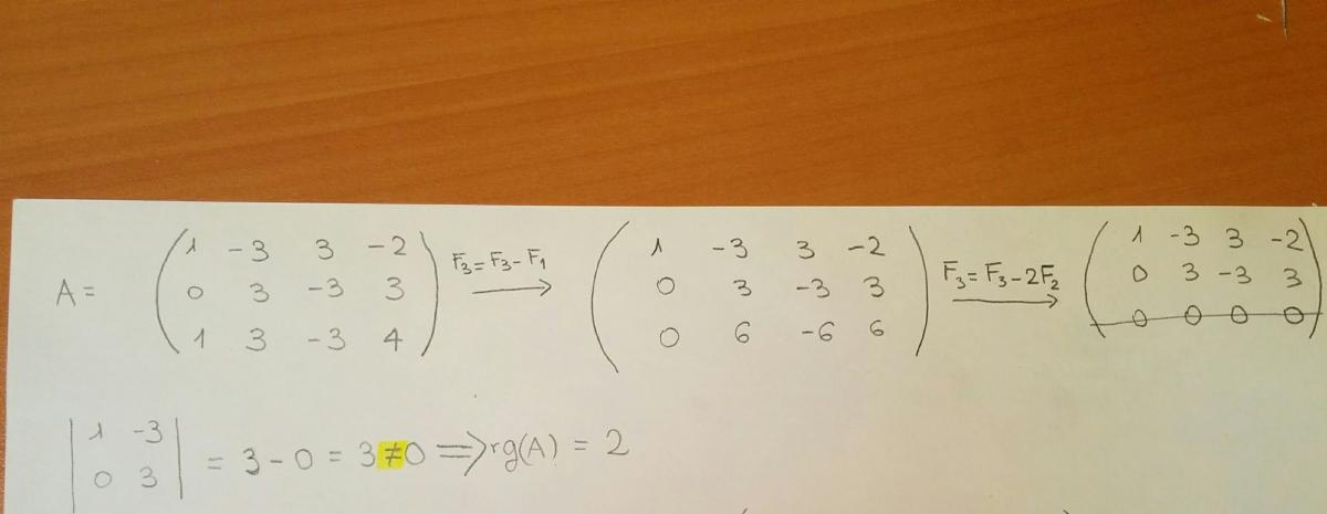 Luego, observa que el determinante de la submatriz de orden dos cuyos elementos hemos remarcado es igual a 3, que es distinto de cero, por lo que tienes que el rango de la matriz es 2.