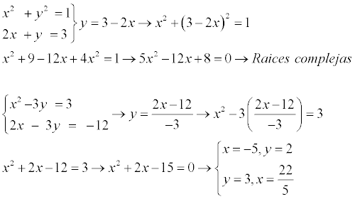2x +y =3 si despejo y =3 - 2x y reemplazando en la segunda ecuación obtengo la siguiente ecuación : x2 -8x +8 = 0 aplicando la fórmula de Baskar me dá 8 +- V32 /2 para mi no tiene solución ¿ está bien?