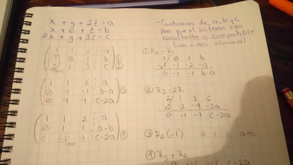 ¡Ayuda!, cuando intento hacer la diagonal de 1's, el sistema se hace incompatible y necesito encontrar en que condiciones de a,b y c el sistema es compatible y la verdad no sé que hacer después (o antes) de ese punto.