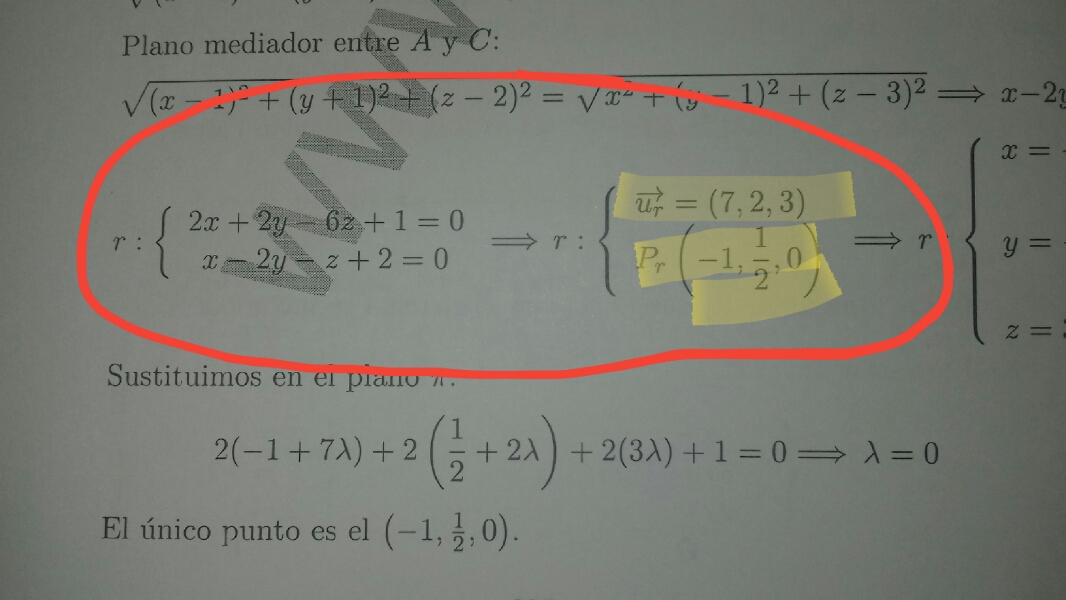 Luego, para determinar un punto de la recta (observa que debe pertenecer a ambos planos), determinas un valor arbitrario para una de las variables,