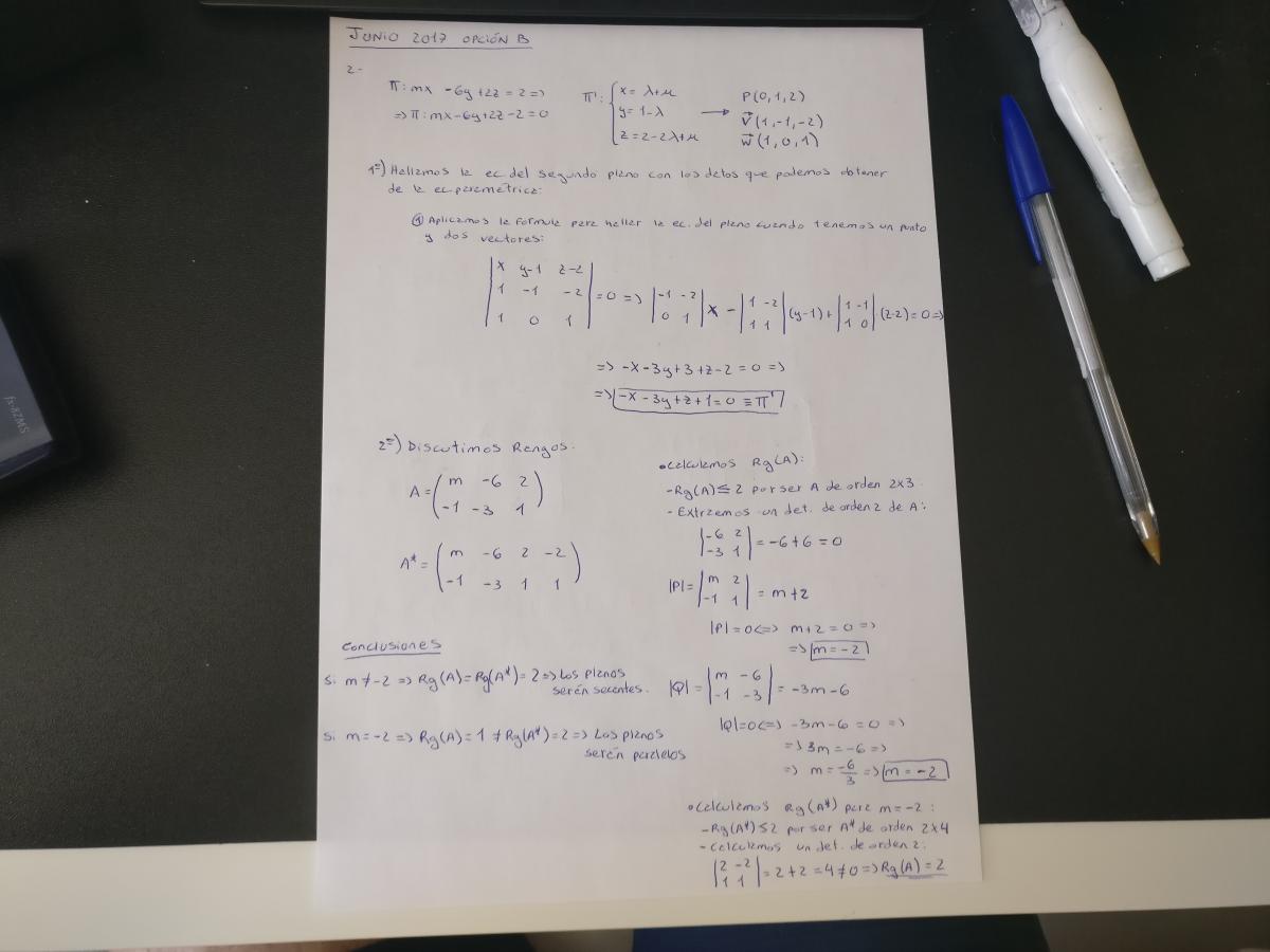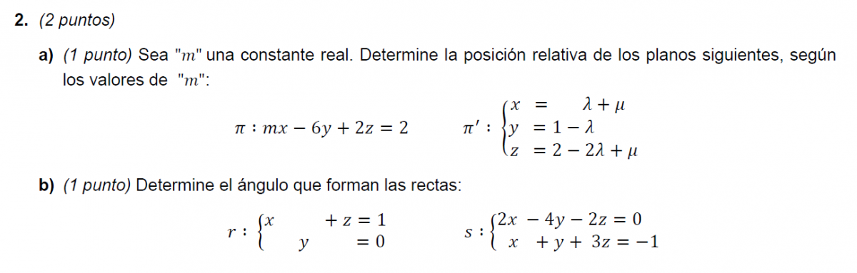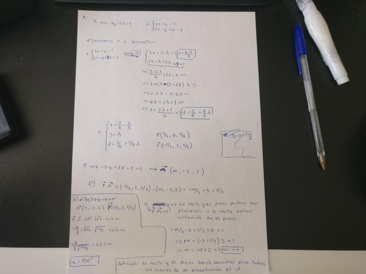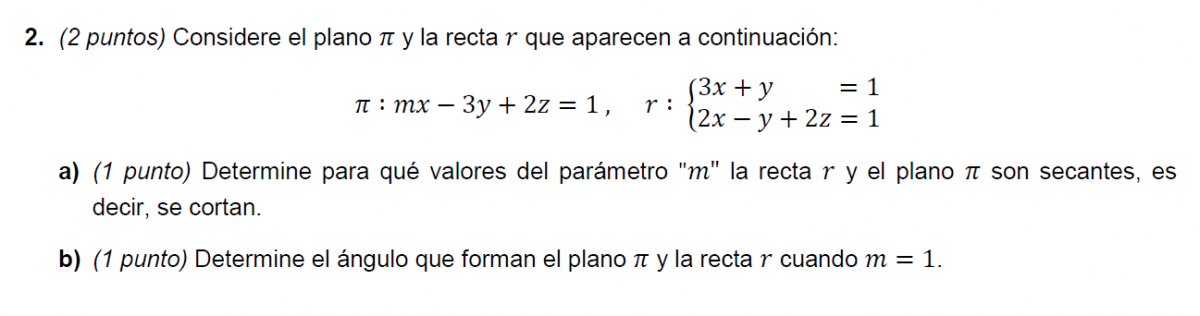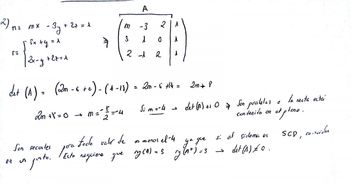 Respecto al apartado a, pienso que la solución de m=1 no es válida, ya que para que sean secantes el rango de la matriz resultante de agrupar el plano pi y los planos que conforman la regla s debe ser 3, y por tanto el determinante debe ser distinto de 0, para lo cual la única solución es que m sea distinto de -4:
