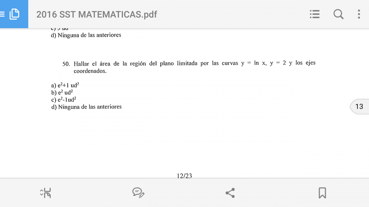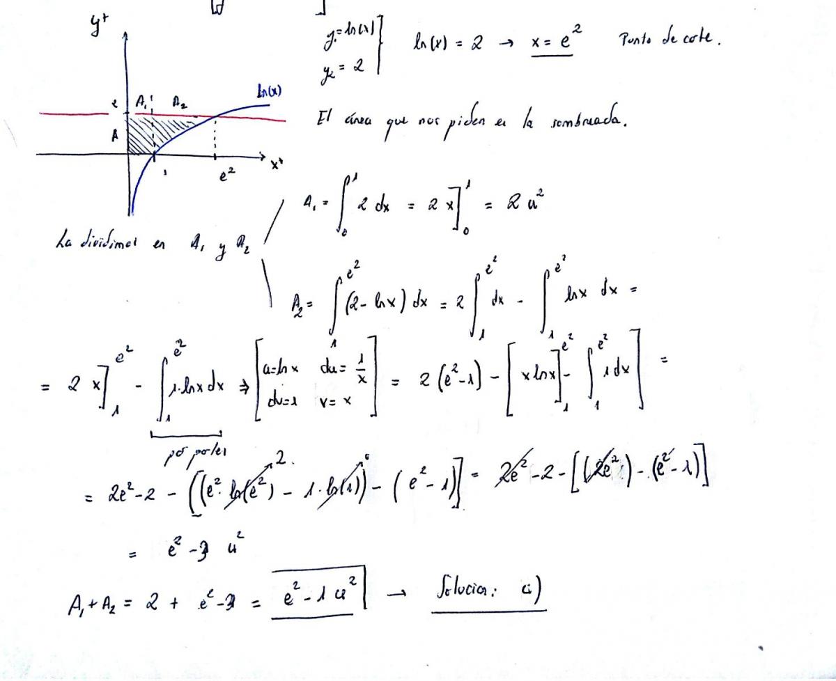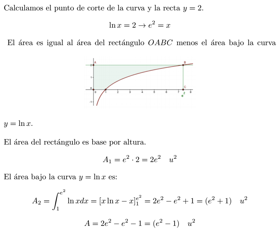 Alguien que me pueda decir como resolver esta área? Calculo el valor de x para cuando y vale dos y me sale e^2 Y con eso calculo la integral definida de la función entre el 1 (con cero la función no existe) Y e^2.