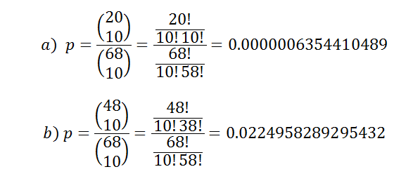 En el juego de la Súper 10 el jugador escoge 10 números de entre 68. La combinación ganadora está formada por 20 números. ¿Cuál es la probabilidad de ganar el premio máximo, es decir, que los 10 números escogidos formen parte de la combinación ganadora? ¿Cuál es la probabilidad de no acertar ningún número de la combinación ganadora?