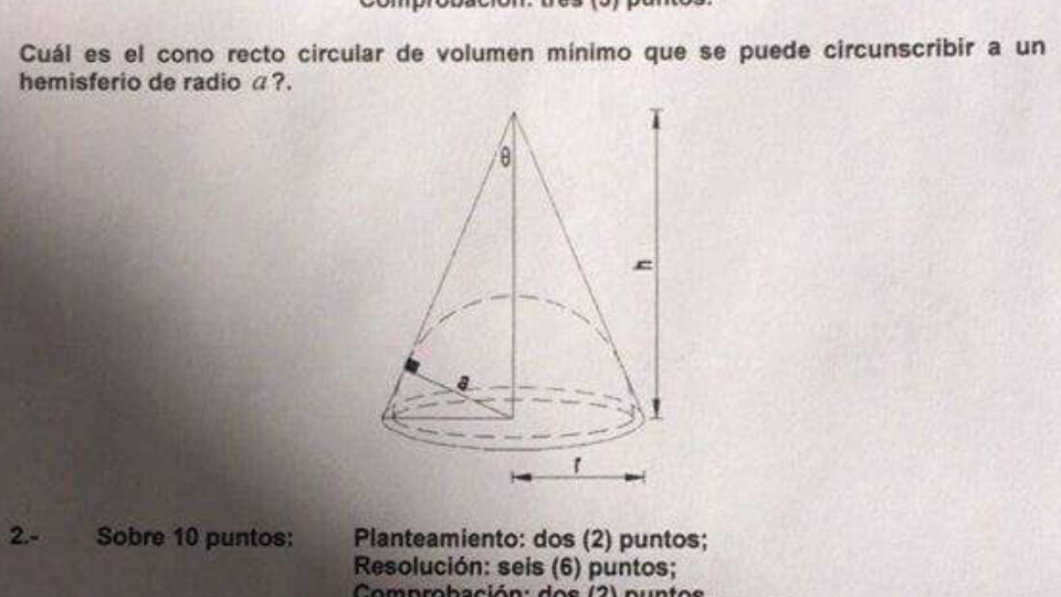 Imaginemos hacer un corte a través de un plano vertical que contenga el eje del cono (y también un diámetro del hemiesferio). Dibujemos las figuras que imaginamos ver: un triángulo isósceles ABC de base AC = 2 R, siendo R el radio del cono, el vértice B y altura h que corta a la base AC en D. Tracemos también un radio perpendicular a BC de manera que sea E el punto de corte. En ese conexto, se tiene lo siguiente: