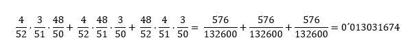 Y la siguiente la obtendremos como: 3/51. Porque debemos suponer que la hemos obtenido en la anterior y que, al mismo tiempo, hay una carta menos en la baraja porque no se reemplaza. Después, para cumplir el resto del condicionante, debemos suponer que ya sólo podemos obtener cartas aleatorias, por tanto, tendremos: 48/50.