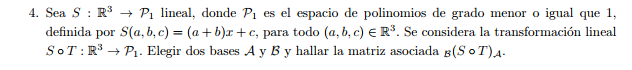 ESTOY HACIENDO ESTE EJERCICIO plantee la parte para hallar la matriz asociada a las bases canonicas de R*3 y de P1 y me dio pero para hallar la matriz asociada a T no supe que hacer..