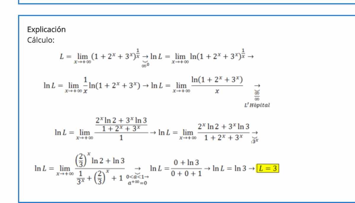 ln(L) = Lim(x→+∞) x*ln(2/3), resuelves (observa que ln(2/3) ≅ - 0,4055 < 0) y queda: