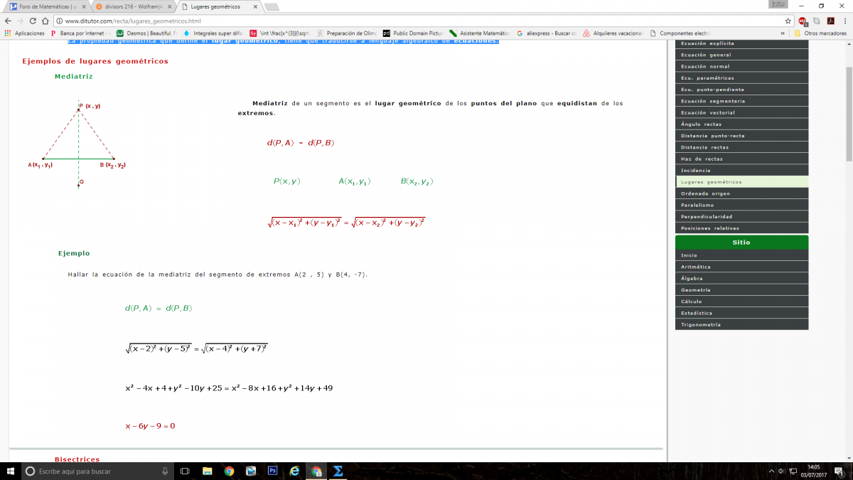 He intentado buscar en internet sobre lugares geométricos y sus formulas, ya saben, como calcular el baricentro, el circuncentro, el ortocentro, la mediana, la mediatriz y la bisectriz si los datos que tienes son tres puntos (x,y) que forman un triángulo. ¿Me lo pueden explicar por favor? Es que necesito las fórmulas para mi examen de recuperación de mates... (si respondes a ésta pregunta y no me doy cuenta te agradezco ahora por adelantado, gracias)