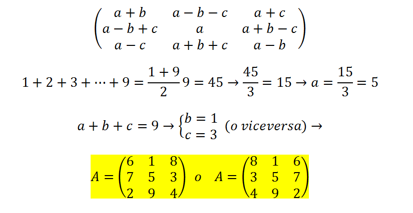 Construid una matriz mágica de orden tres con los números naturales del 1 al 9.