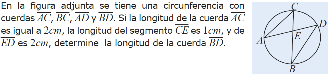 Nota que los ang AEC=BED por ser opuestos en el vertice E, ademas los ang. ACB=ADB pues comparten el mismo arco, que es el AB, por tanto, los triangulos ACE y BED son semejantes, pues ya tienen un par de angulos iguales, no queda mas que en el tercero tambien sean iguales, es decir que los ang CAE=EBD