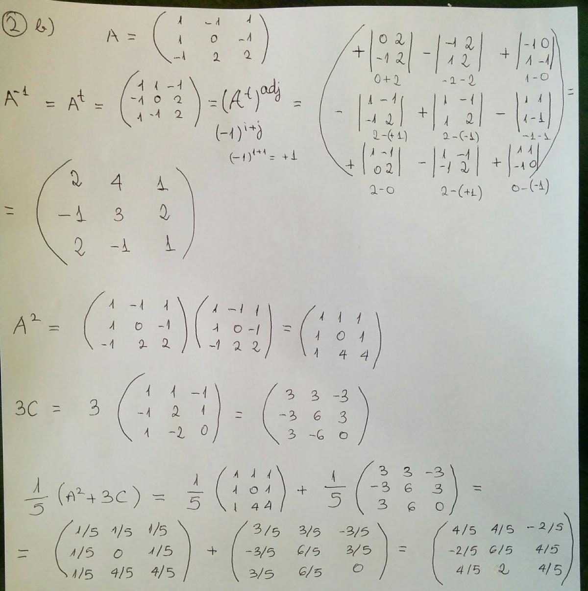 Lo has hecho muy bien, para calcular la inversa tienes que hacer, como bien has hecho, la adjunta de la traspuesta y luego multiplicar esa matriz por 1/|A|, en este caso |A|=5, luego multipliquemos la adj(At) por 1/5, quedara