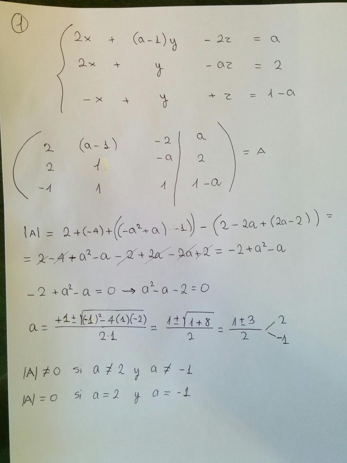 Si |A|≠0, entonces al ser A una matriz de 3x3, el conjunto de vectores formado por las filas sera linealmente idependiente y por defincion eso es el rango, entonces R(A)=3, al ser el rango a A igual a 3, el rango de la ampliada sera tambien de 3, y coincide con el numero de incognitas en el sistema, luego, el sistema tendra solucion unica si a es distinta de 2 o -1