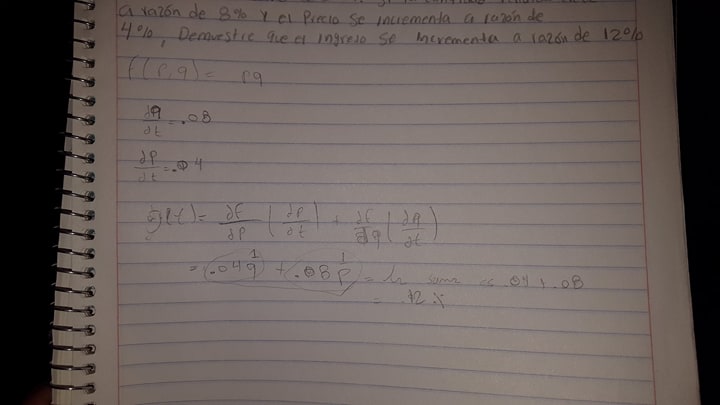 Hola, buenas tardes. Me han dejado un problema de cálculo vectorial donde necesito demostrar cómo se incrementa un ingreso a razón de 12%. Este es el problema: