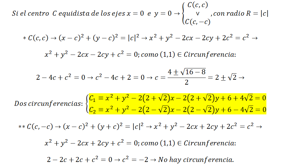 ''Hallar las ecuaciones de todas las circunferencias que pasan por P(1,1) y son tangentes a OX y a OY.''