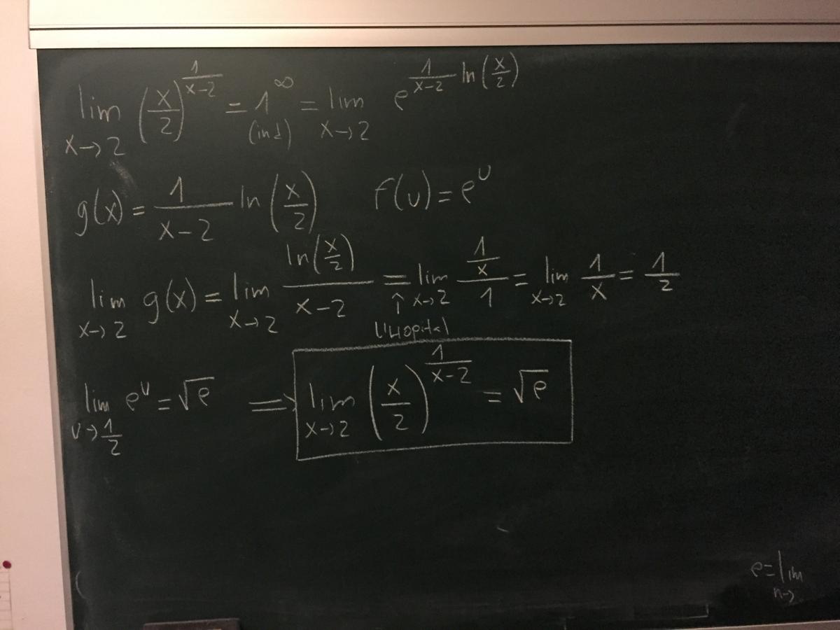 Vuelvo a tener un problema con un límite. Lim x->2 (x/2)1/(x-2). Es una indeterminación de 1^∞ y ahora no sé cómo seguir. No puedo utilizar la fórmula del número e porque es 1 más 1 partido de algo a lo que más tarde se eleva todo y en mi límite no aparece 1 más ni el denominador se asemeja en nada al exponente.